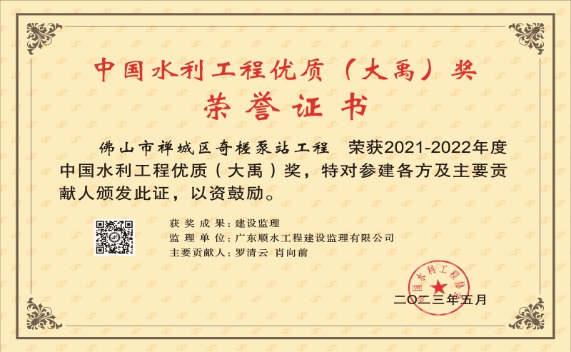 中國水利工程優(yōu)質(zhì)(大禹)獎(jiǎng)-佛山市禪城區(qū)奇槎泵站工程