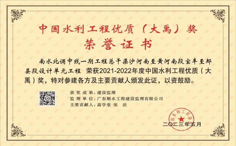 中國水利工程優(yōu)質(zhì)(大禹)獎(jiǎng)-南水北調(diào)中線一期工程總干渠沙河南至黃河南段寶豐至郟縣段設(shè)計(jì)單元工程